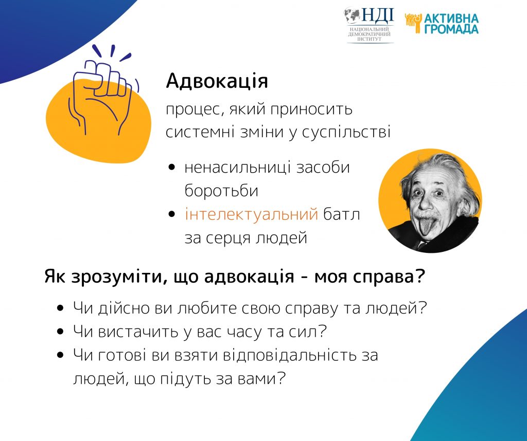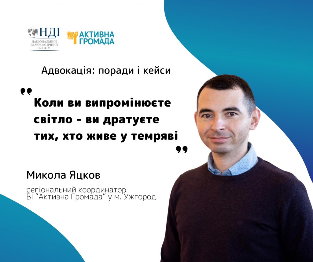 Жодні соціальні зміни неможливі без адвокаційної кампанії. Якщо ви активний громадянин і лідер, вам варто розумітись на принципах ефективної адвокації. Регіональний координатор ВІ “Активна Громада” в м. Ужгород, Микола Яцков, розповів про те, як вести за собою людей і творити важливі зміни в громаді. Ділимось інфографікою та ключовими порадами з тренінгу.