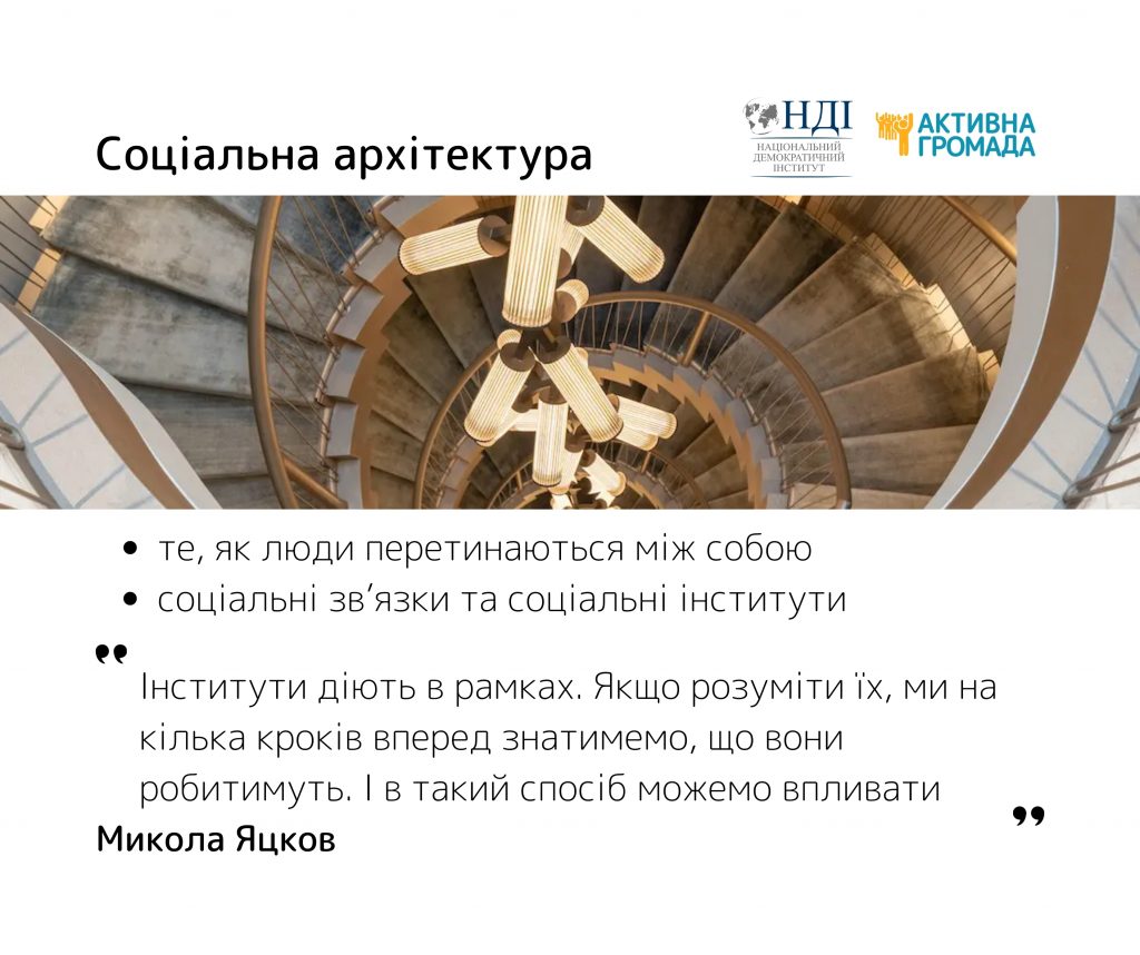 «Ми маємо розуміти соціальну архітектуру, рамки, в яких діють інститути. Ці рамки є запрограмовані. Тому ми на кілька кроків вперед можемо чітко розуміти, що вони робитимуть і як.
